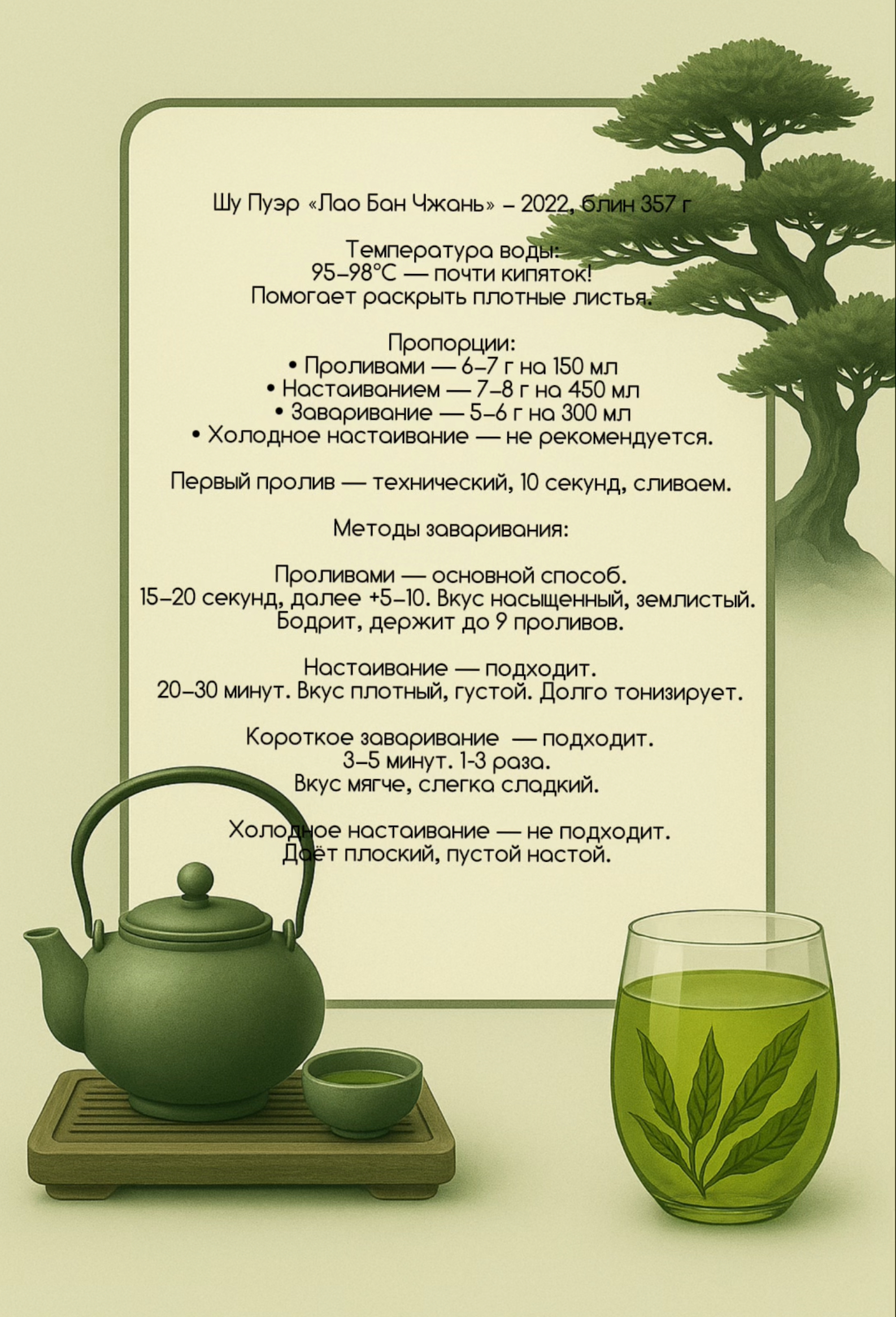 Происхождение: ✦ Деревня Лао Бан Чжан, уезд Мэнхай, провинция Юньнань (Китай); регион ценится за высококачественное сырье, мощный характер и выдержанный вкус.