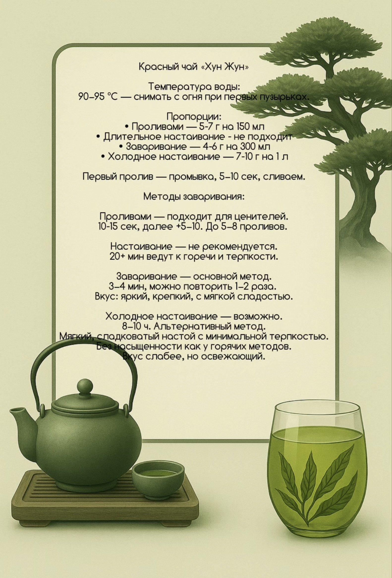 – Даёт мягкую, ровную бодрость без напряжения. – Освежает и помогает сосредоточиться, сохраняя спокойствие. – Хорошо подходит для неспешного чаепития.