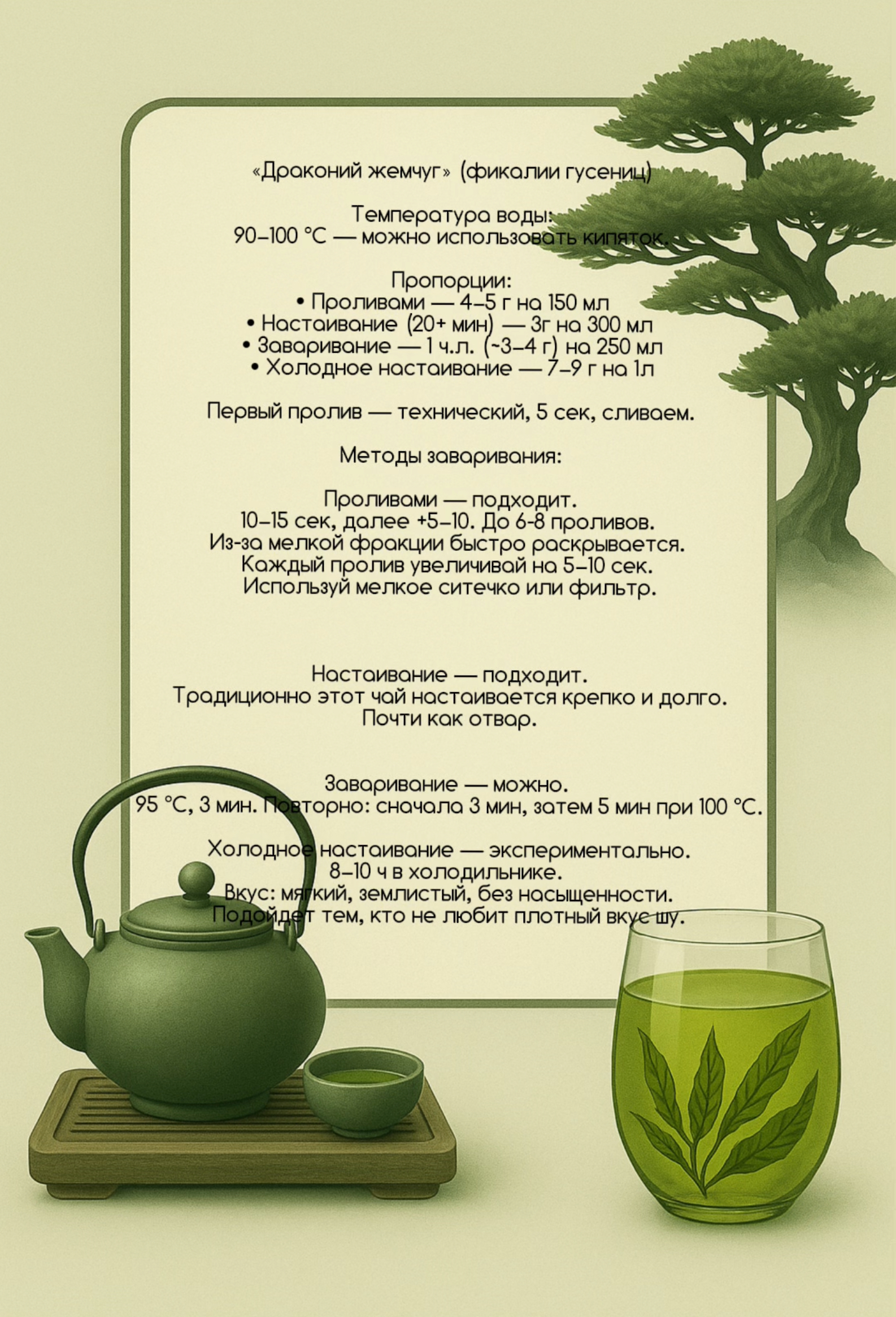 Необычный продукт китайской традиции — результат естественной ферментации выдержанного Лю Бао в организме гусениц. Это не шутка: сырьё — листья 30-летней выдержки, которыми кормили насекомых. Затем материал сушат, стерилизуют и прессуют. В Китае его ценят за эффект расслабления и восстановления, используют в народной медицине.