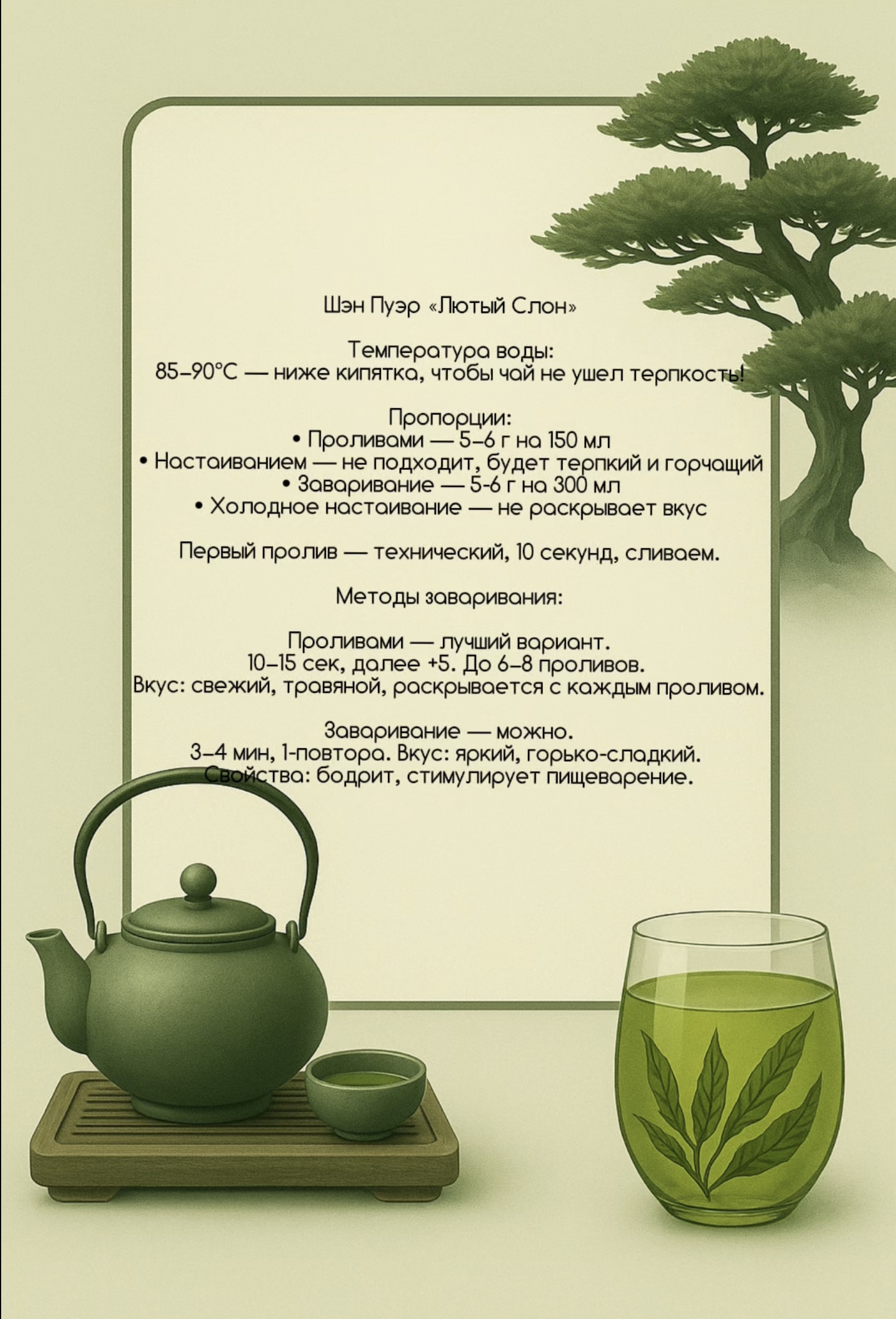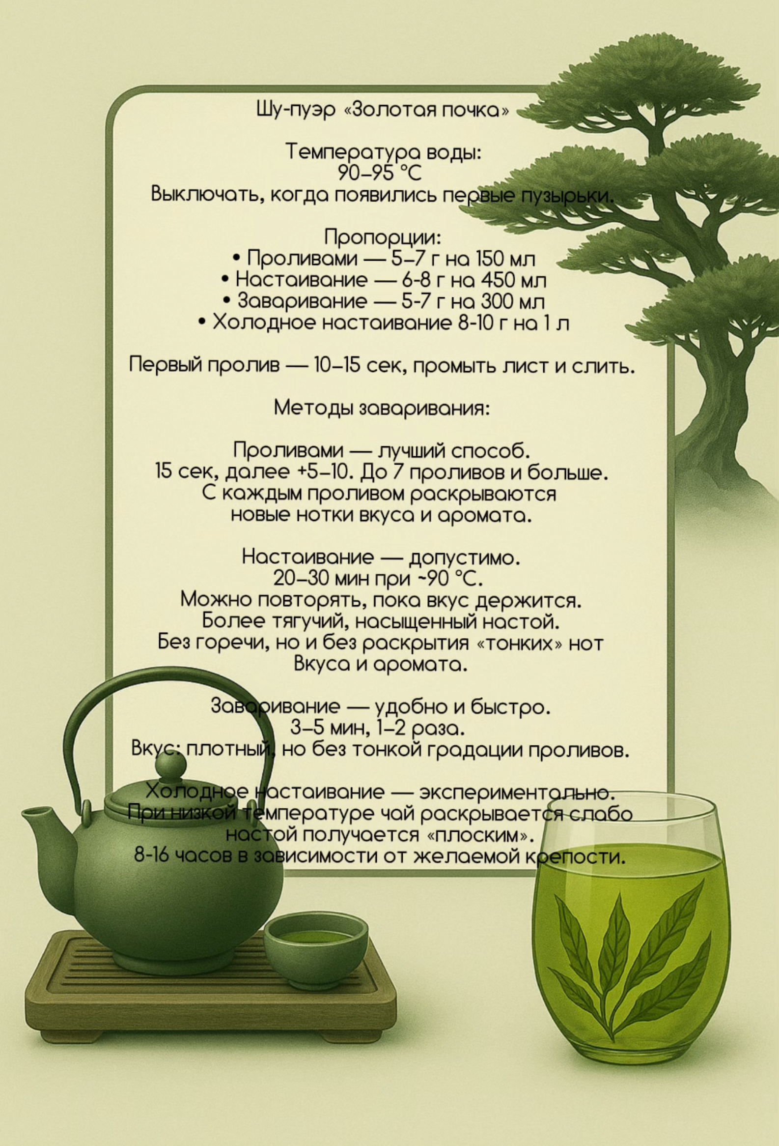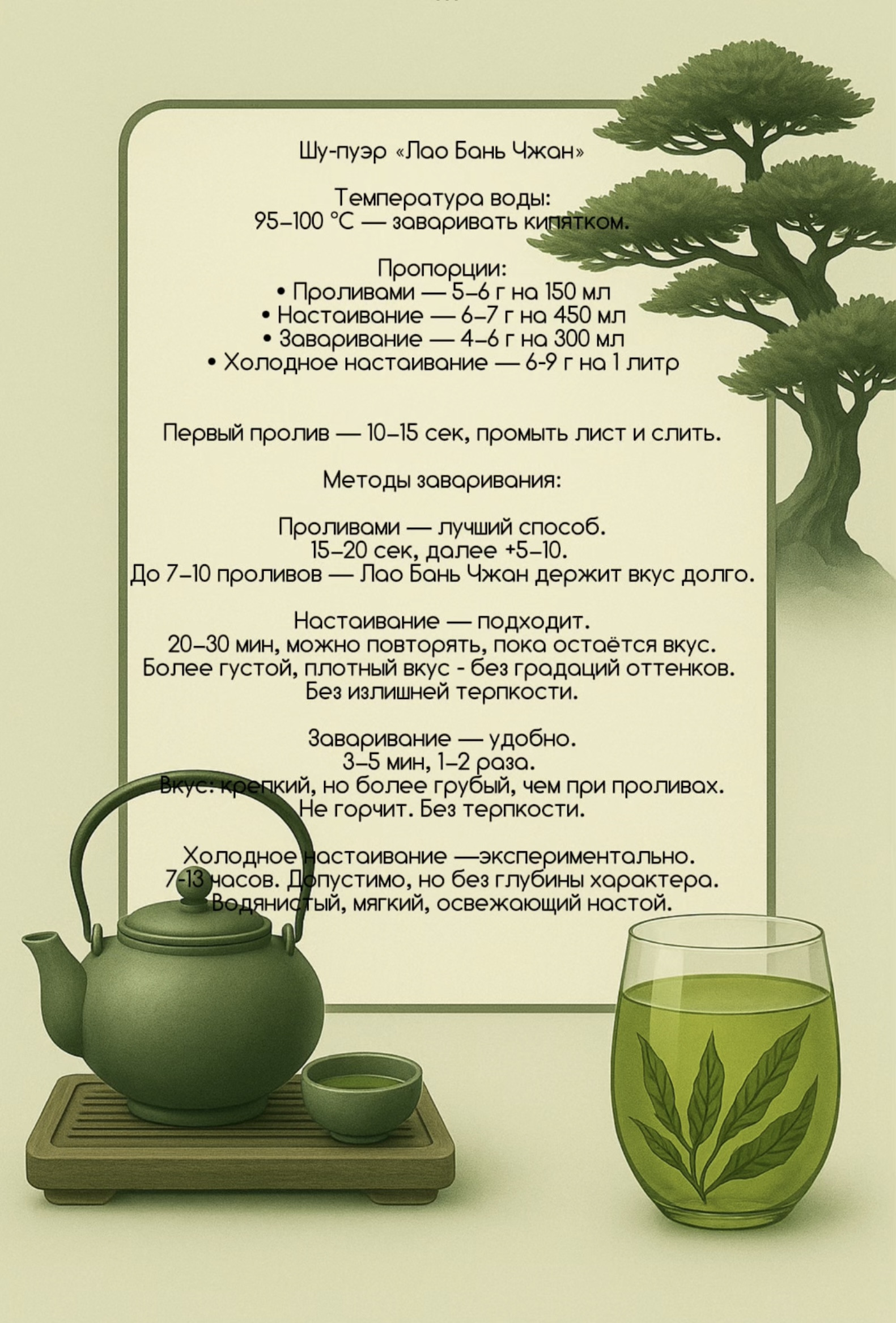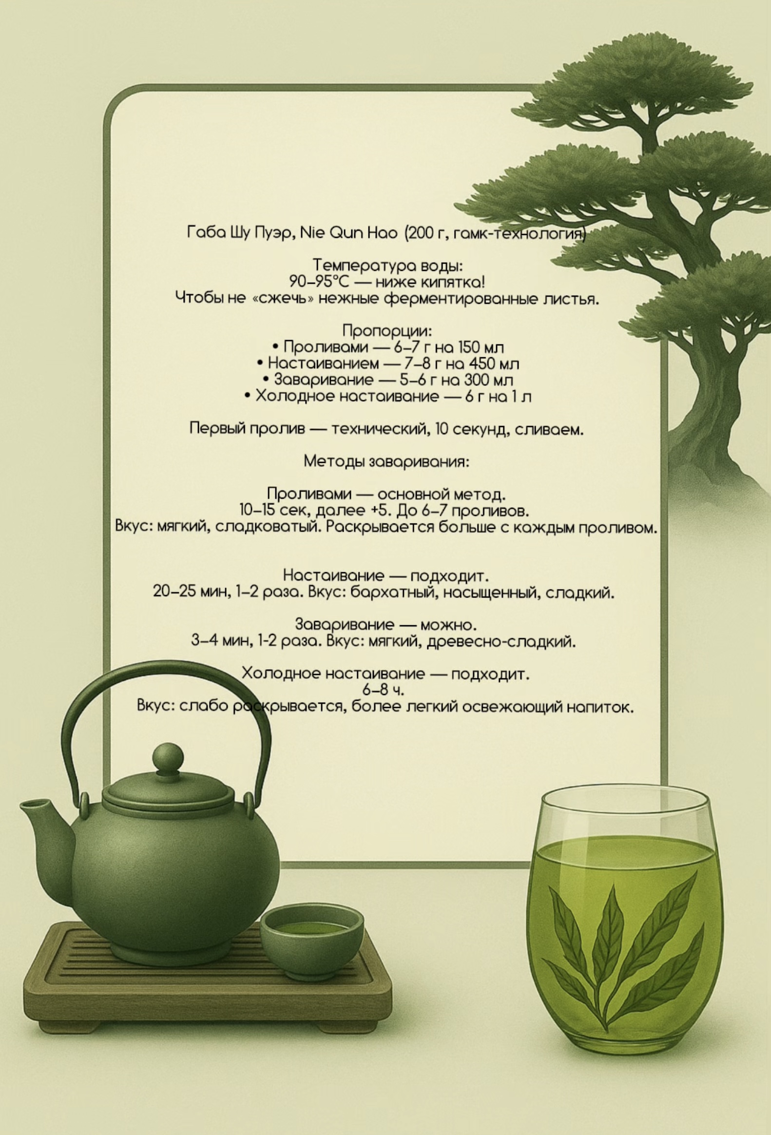 ✦ Очень чистый, тонкий вкус без терпкости ✦ Лёгкая естественная сладость ✦ Ноты свежих почек, молодой зелени и белых цветов ✦ Долгое, мягкое послевкусие с ощущением свежести и прохлады